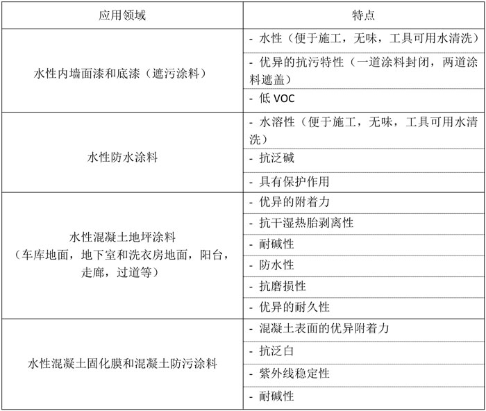 水性,低VOC 優(yōu)異的抗污特性 抗泛白 耐堿性 優(yōu)異的附著力 抗磨損性 優(yōu)異的耐久性  |